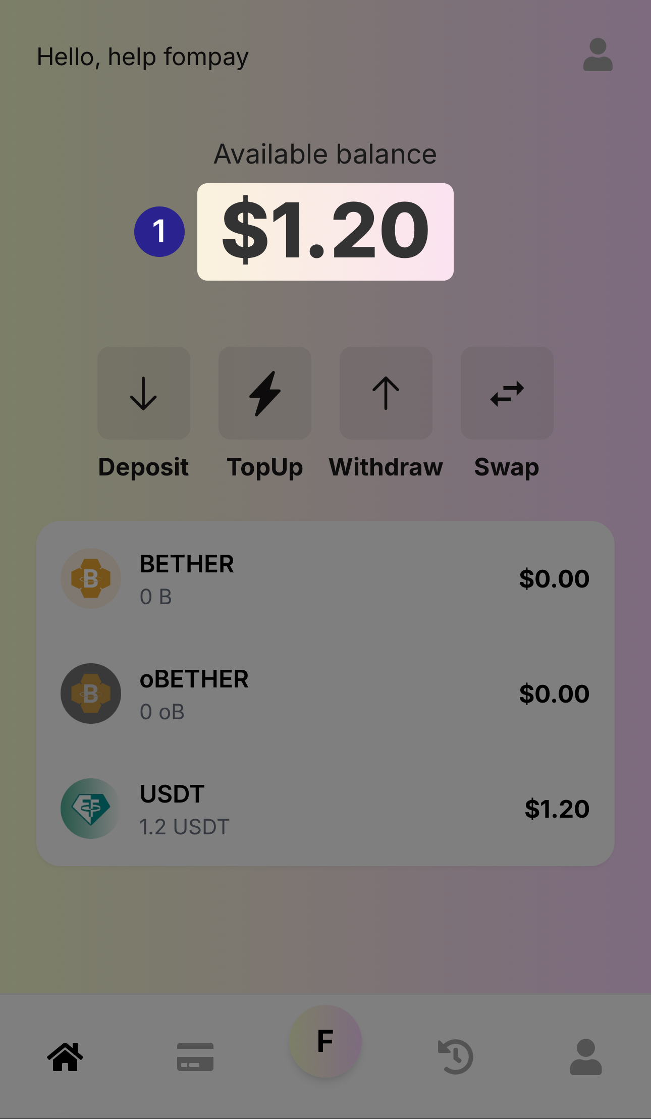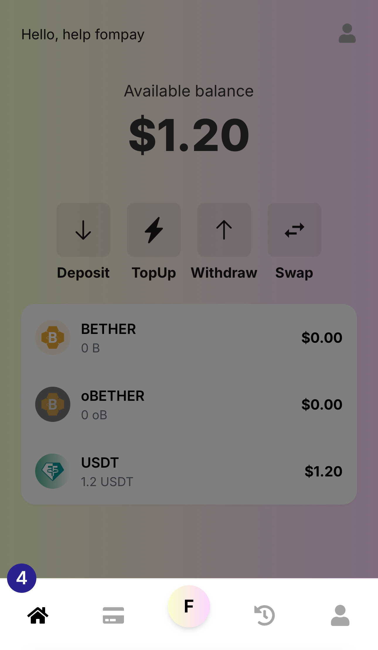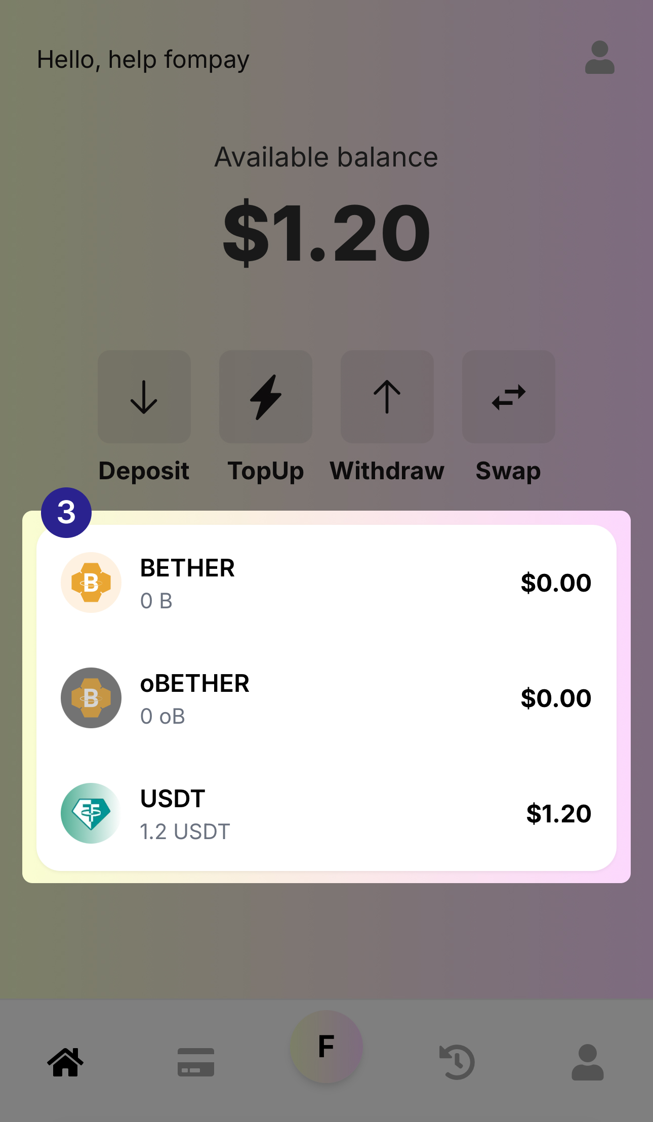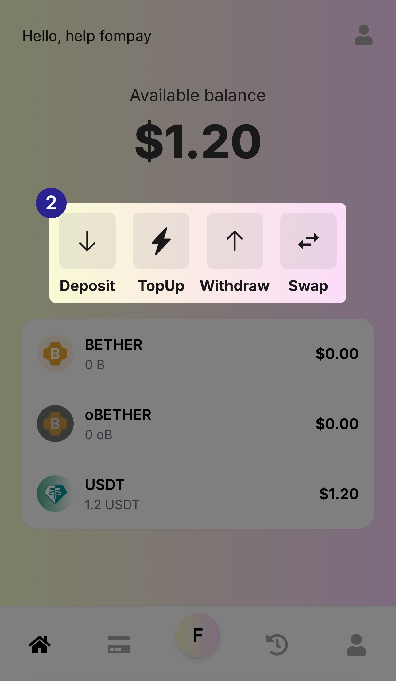 Deposit : Menu to deposit BETHER or USDT into your FOMPAY Wallet.
